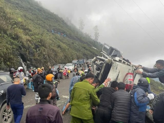 Khi xe đi đến khu vực dốc Cán Tỷ, phương tiện bất ngờ gặp sự cố và lật nhào. Tại hiện trường, chiếc xe bị hư hỏng nặng, thân vỏ dập nát hoàn toàn sau va chạm.