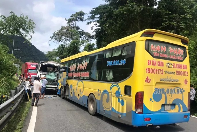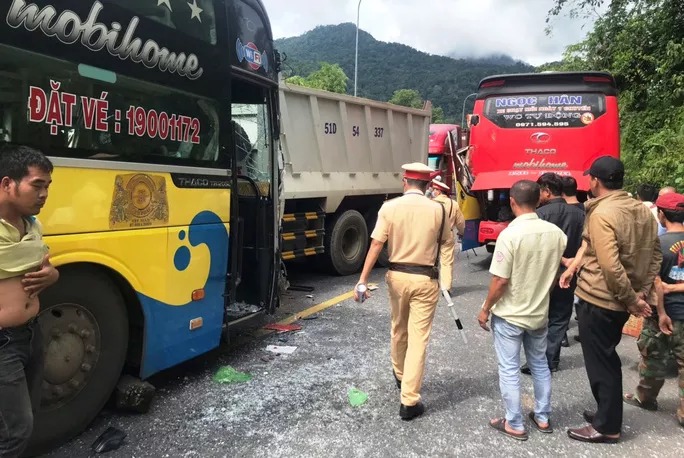 Cùng lúc này, xe khách giường nằm do tài xế Phạm Văn Đang (44 tuổi, quê Nam Định) điều khiển không kịp xử lý đã húc vào đuôi xe khách.