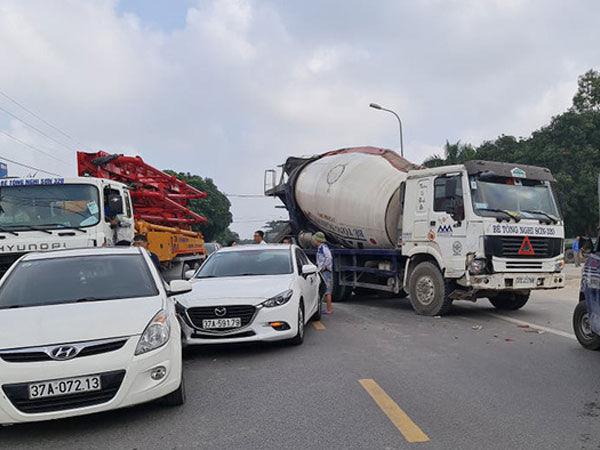 Cùng lúc, từ phía sau, chiếc xe chở bê tông tươi Nghi Sơn mang BKS 37C-217.48 (chưa rõ danh tính tài xế) lao tới, đâm vào đuôi xe con Mazda 3 mang BKS 37A-591.79.