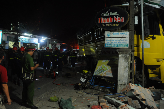 Tại hiện trường, chiếc xe tải tông vào nhà dân và kẹt cứng, dưới gầm xe có người chết. Hiện dưới gầm xe rất ngổn ngang bởi chiếc xe tải tông nhiều vật dụng và cuốn cả xe máy.