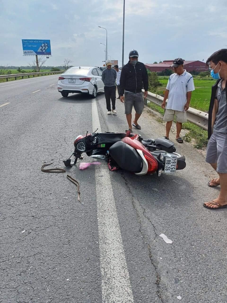 Chiếc ô tô mang biển số của tỉnh Quảng Nam lưu thông trên tuyến đường tránh Quốc lộ 1 lấn sang làn đường ngược lại, va chạm với 2 xe máy.