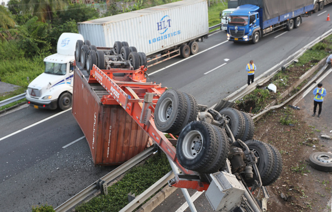 Sáng 19/4, thông tin trên báo Tuổi Trẻ, Đội tuần tra kiểm soát giao thông đường bộ cao tốc số 7 Cục CSGT (Bộ Công an) cho biết đang điều tra nguyên nhân một xe container lật trên đường cao tốc TP.HCM - Trung Lương khiến kẹt xe trong hơn 2 giờ.