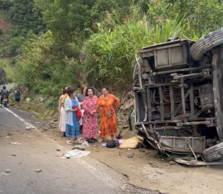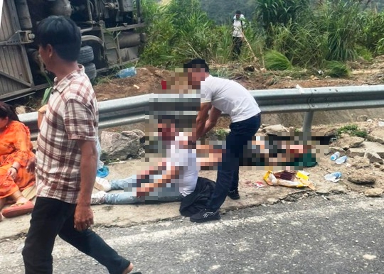 Ôtô khách trượt một đoạn dài, phần đầu nghiêng về một bên đường, bị biến dạng. 23 người bị kẹt trong xe, hoảng loạn, kêu cứu. Nhiều người xây xước khắp cơ thể, đập cửa xe đi ra ngoài. Vụ tai nạn làm 4 du khách Trung Quốc tử vong (chưa rõ danh tính) và nhiều người khác bị thương.