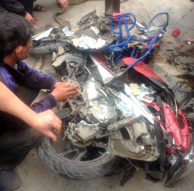 Vụ tai nạn khiến người ông cùng cháu gái tử vong dưới đống cát, còn cháu trai được đưa đi cấp cứu tại Bệnh viện Đa khoa tỉnh Hải Dương và xe máy nạn nhân hư hỏng nặng.