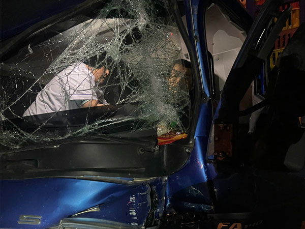 Sau va chạm, tài xế Lê Bùi Anh bị thương, mắc kẹt trong cabin bị biến dạng, vỡ kính chắn gió.