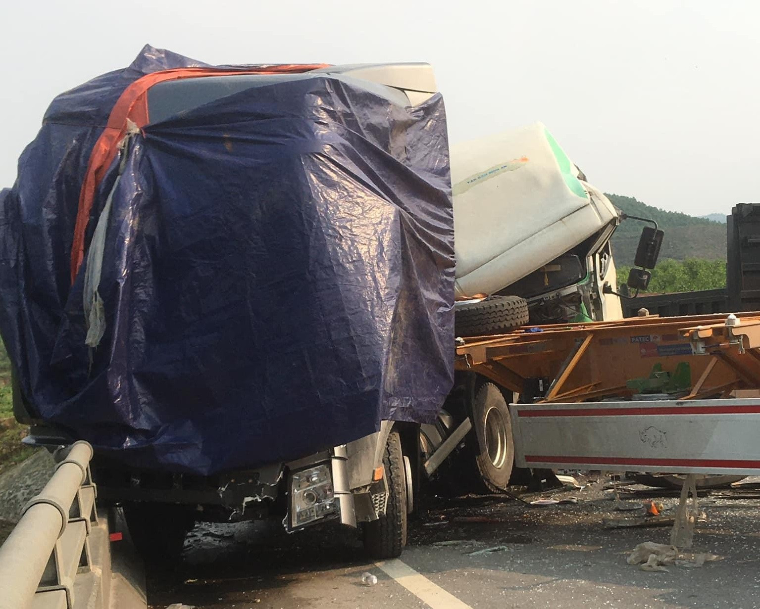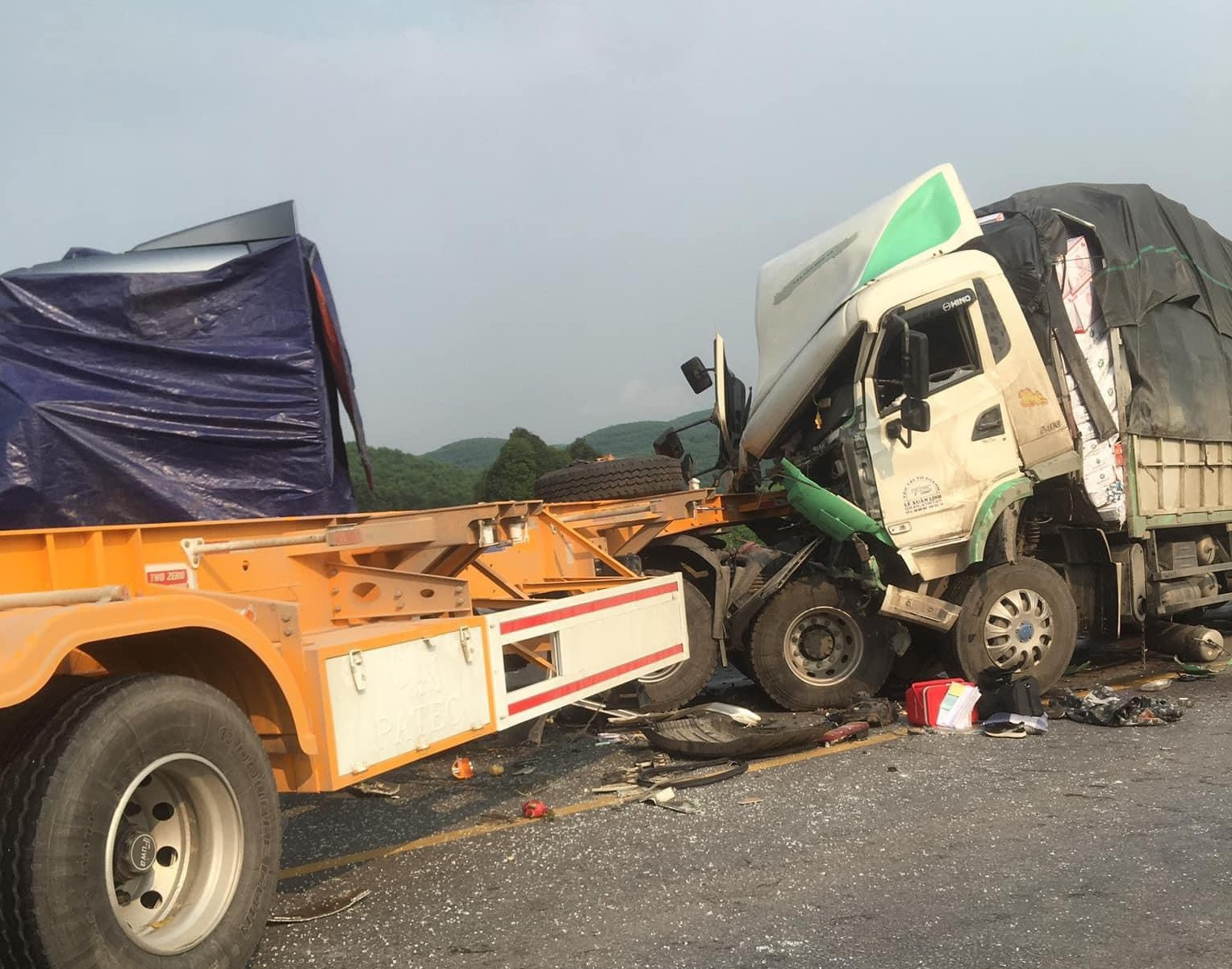 Sau khi xảy ra tai nạn, xe đầu kéo nằm xoay ngang đường, ô tô tải bị húc văng, nằm ở làn trái tuyến.