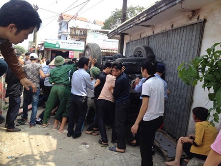 Nhiều người dân giúp đỡ 3 người trên chiếc xe gặp nạn. Ảnh: Otofun. |