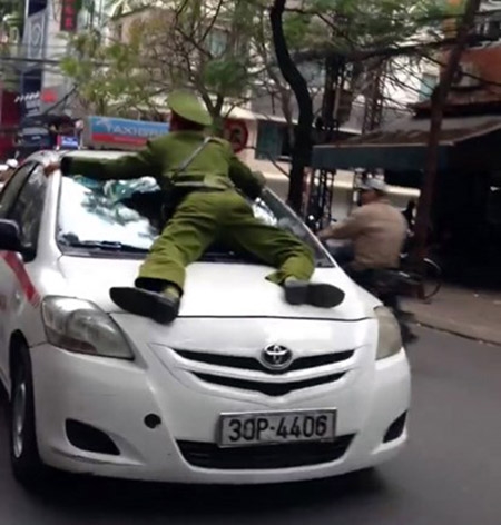 Cán bộ công an nằm trên đầu xe taxi (Ảnh chụp từ clip Otofun) |