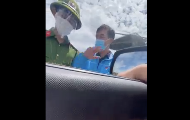 Lúc này, một người đàn ông mặc áo khoác xanh bất ngờ lao nhanh đến và yêu cầu cán bộ công an mời tài xế quay đầu xe, không được qua chốt với lý do tiền là "mặt hàng không cần thiết".
