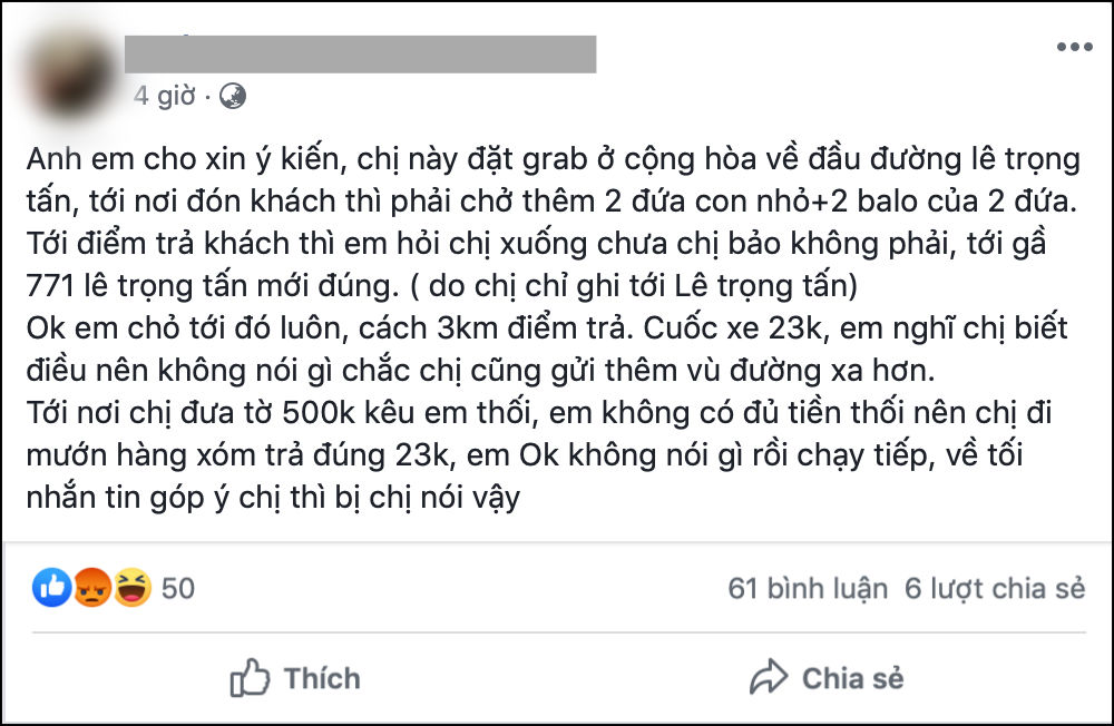 "Khi đi xa quá điểm đến hoặc đi vào ngõ sâu, vòng vèo thì nên gửi thêm cho tài xế 1 chút chị gái ơi, người ta gọi là văn hoá khi đi xe đó. Chứ tiền công ty trả cho tài xế cũng là tiền xăng, tiền công họ bỏ ra chạy xe trên đường mà có ai tự nhiên mà có tiền đâu, chị kỳ thế" - chị M.H viết.