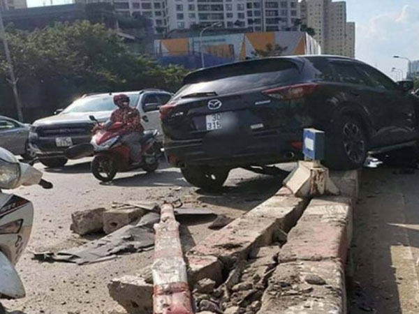 Tại hiện trường, xe ô tô Mazda CX5 này đã nằm đè lên trên khu vực dải phân cách, cú va chạm rất mạnh khiến đầu xe ô tô hư hỏng nặng, gần như biến dạng, những khối bê tông của dải phân cách vỡ vụn, văng tung tóe trên đường.
