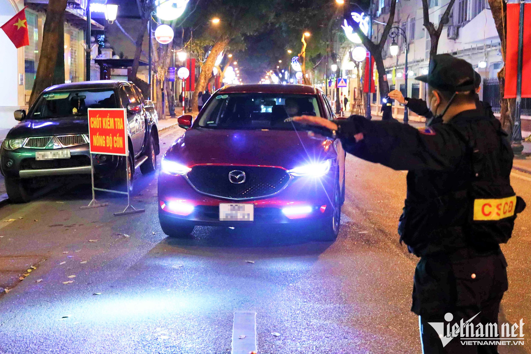 Tại đây, lực lượng chức năng ngăn một phần phố Tràng Thi để kiểm tra nồng độ cồn người điều khiển phương tiện.