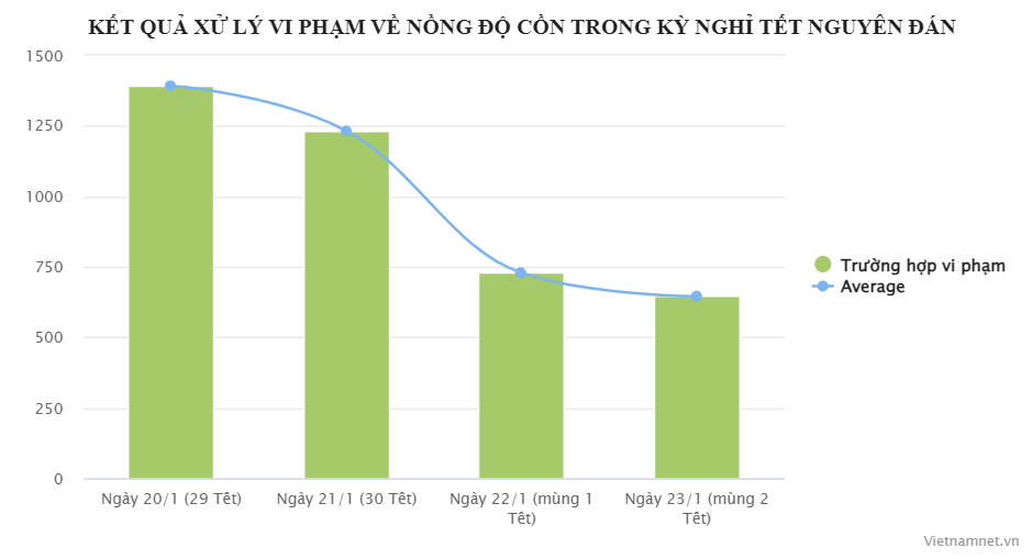 Theo thống kê của Cục CSGT (Bộ Công an), từ đầu kỳ nghỉ lễ đến nay (20/1- 23/1), lực lượng CSGT toàn quốc đã phát hiện, xử lý 3.999 trường hợp vi phạm nồng độ cồn. Riêng trong ngày mùng 2 Tết, đã có 646 tài xế vi phạm bị xử lý.