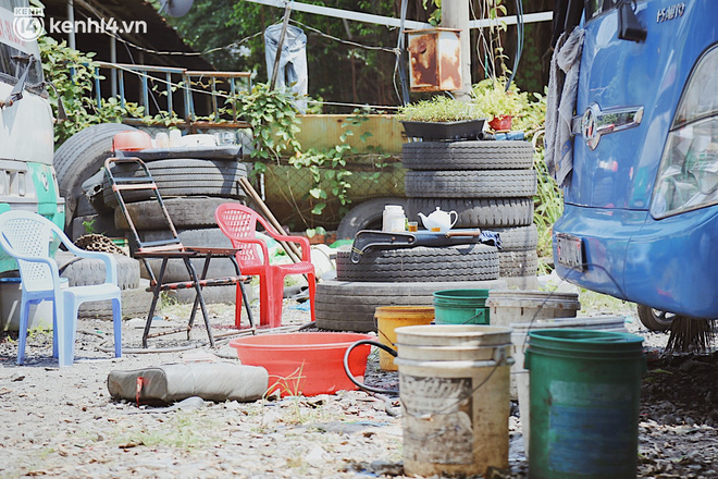 Trong không gian chật hẹp của chiếc xe buýt, một góc chú Cường để bếp ga nhỏ để nấu ăn, góc còn lại là những can nước mưa hứng được dùng trong việc tắm giặt. Mọi vật dụng đều thô sơ. Không điện, thiếu nước nhưng nhiều ruồi muỗi hay tiếng vo ve của côn trùng.