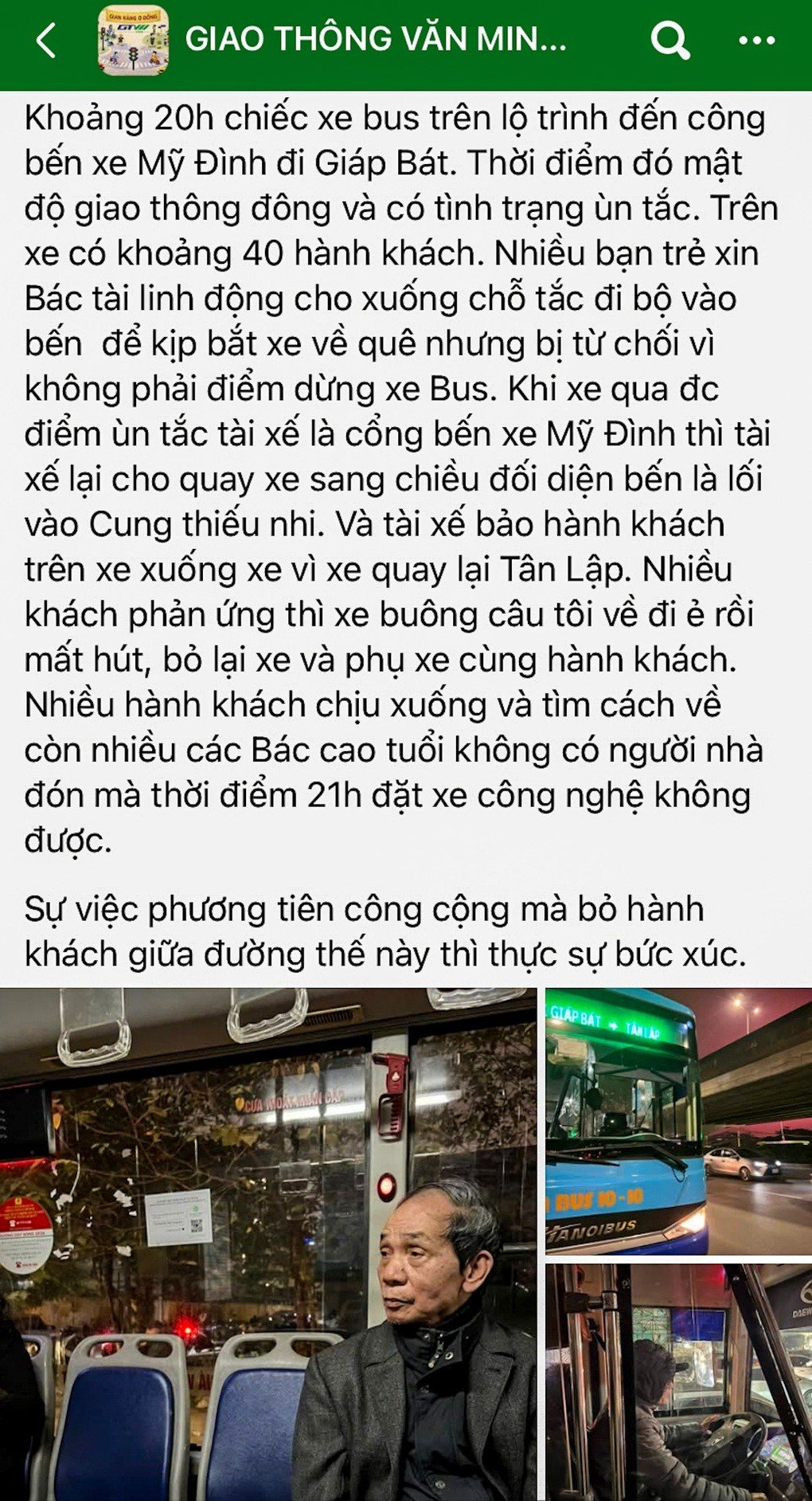 Trao đổi với phóng viên chiều tối 24/1, đại diện Xí nghiệp xe buýt 10-10 cho biết ngay sau khi tiếp nhận thông tin từ người dân, đơn vị đã khẩn trương vào cuộc xác minh. Đồng thời, xí nghiệp đã cử cán bộ, nhân viên liên hệ trực tiếp với từng hành khách trên chuyến xe để gửi lời xin lỗi vì sự việc gây phiền toái.
