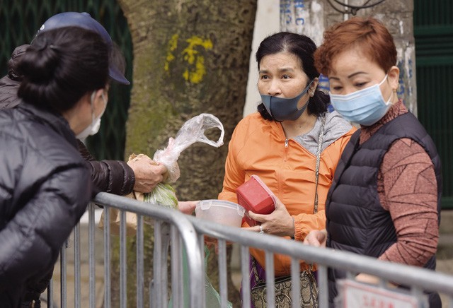 Sáng 7/3, con phố Trúc Bạch khá yên ắng, thỉnh thoảng người dân ra khu vực barrie để nhận đồ ăn sáng, thực phẩm thiết yếu đặt mua hoặc người thân, đồng nghiệp gửi mang đến với sự trợ giúp của các lực lượng chức năng.