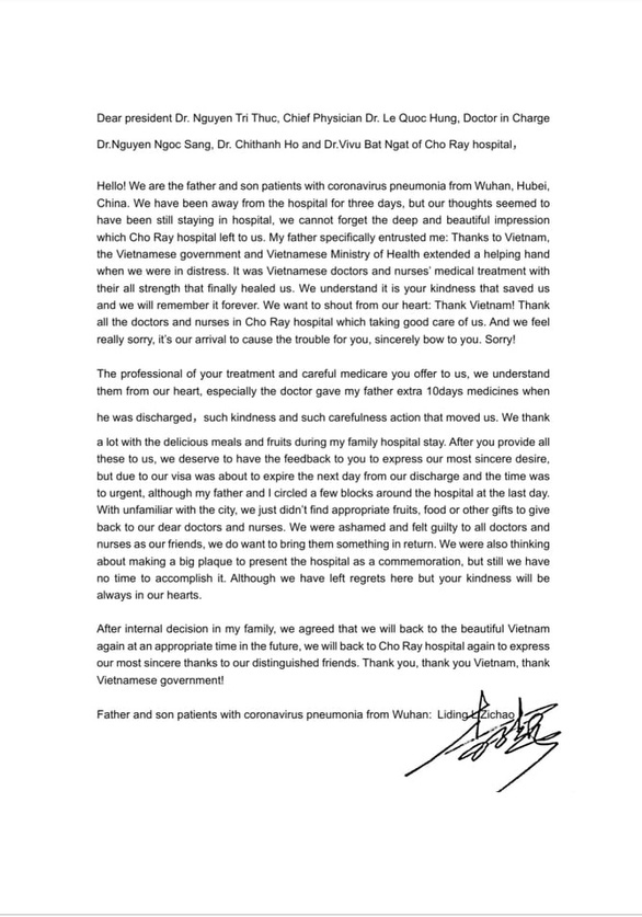 Dưới đây là toàn văn bức thư mà hai cha con người Trung Quốc gửi các y, bác sĩ: tại bệnh viện Chợ Rẫy: