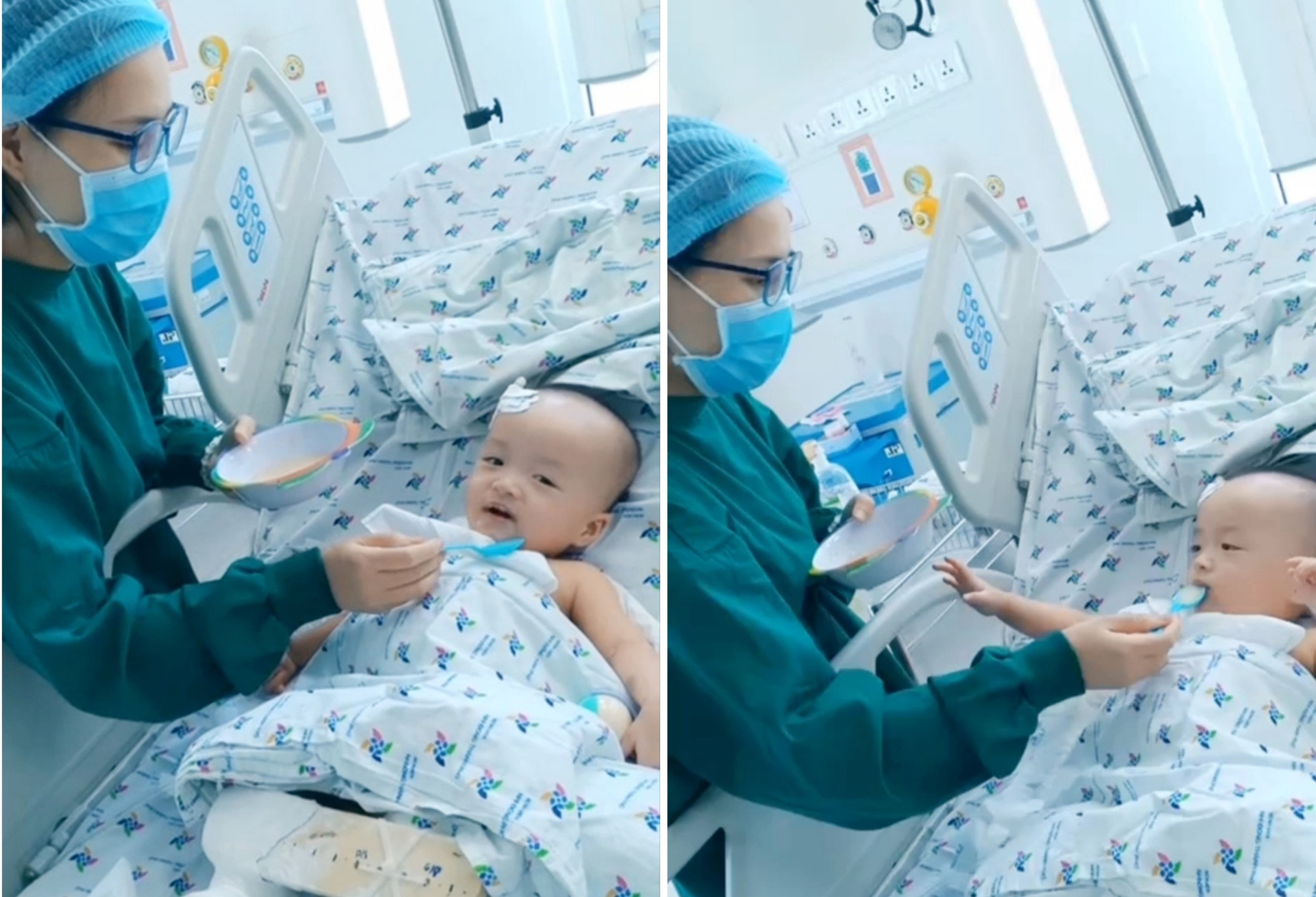 "Sau ca mổ, việc cung cấp đầy đủ dinh dưỡng góp phần không nhỏ trong việc hồi phục chức năng các cơ quan, hỗ trợ việc mau lành vết thương, nâng đỡ tổng trạng cho hai bé. Do đó, chúng tôi đã tính toán rất kỹ lượng để đưa ra thực đơn cháo đầu tiên kể từ sau ca mổ. Nhìn hai con ăn cháo, uống sữa háo hức như các bé khác, trái tim tôi như tan chảy" - bác sĩ Công Minh tâm sự.
