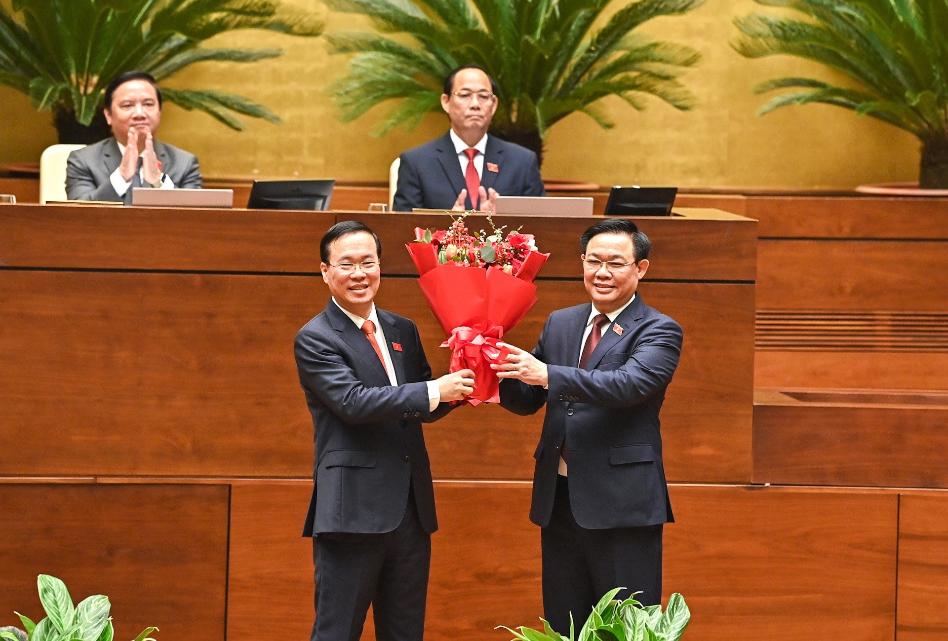 Dưới cờ đỏ sao vàng thiêng liêng, trước Hiến pháp của nước Cộng hòa xã hội chủ nghĩa Việt Nam, trước Quốc hội nước Cộng hòa xã hội chủ nghĩa Việt Nam, trước đồng bào và cử tri cả nước, Tân Chủ tịch nước Võ Văn Thưởng tuyên thệ: “Tuyệt đối trung thành với Tổ quốc, với Nhân dân, với Hiến pháp nước CHXHCN Việt Nam; nỗ lực phấn đấu, hoàn thành tốt nhiệm vụ được Đảng, Nhà nước và Nhân dân giao phó”.