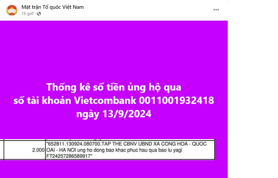 Trong số những giao dịch nói trên, có một nội dung chuyển khoản nhận được khá nhiều sự chú ý từ mọi người. Phần ghi chú viết “Tap the CBNV xa Cong hoa – Quoc oai – Ha Noi ung ho dong bao khac phuc hau qua bao lu yagi” (tạm dịch: Tập thể CBNV UBND xã Cộng Hòa - Quốc Oai - Hà Nội ủng hộ đồng bào khắc phục hậu quả bão lũ Yagi) cho giao dịch với số tiền 2.000 đồng.