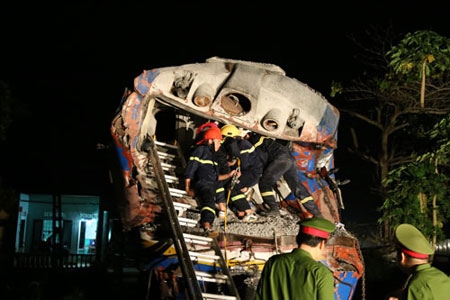 Lực lượng cứu hộ tìm cách đưa thi thể lái tàu ra ngoài. Ảnh: Hoàng Táo |
