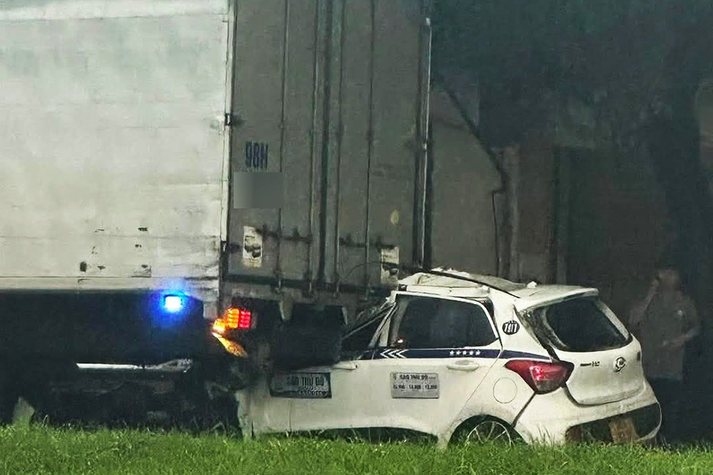 Cú va chạm khiến xe taxi chui lọt vào gầm xe tải, phần đầu biến dạng, hư hỏng nặng, tài xế tử vong tại chỗ và kẹt lại bên trong cabin.