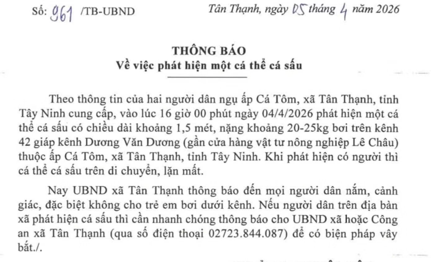 Trong trường hợp phát hiện cá sấu, người dân cần giữ khoảng cách an toàn và nhanh chóng thông báo cho UBND xã hoặc Công an xã Tân Thạnh qua số điện thoại 02723.844.087. Việc báo tin kịp thời sẽ giúp lực lượng chức năng sớm có mặt để tổ chức phương án vây bắt, loại bỏ nguy cơ đe dọa đến tính mạng và tài sản của cộng đồng.