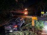 Theo ghi nhận tại hiện trường, chiếc ô tô bị đẩy rơi thẳng xuống mương nước phía dưới. Sau cú va chạm mạnh, phần đuôi xe bị hư hỏng nặng. Rất may mắn, tài xế điều khiển phương tiện đã kịp thời tự mở cửa thoát ra ngoài trước khi lực lượng chức năng có mặt.