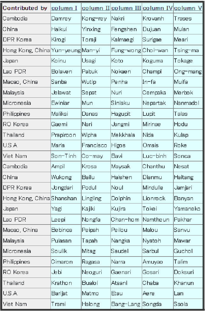 Trung tâm Bão Nhiệt đới Tokyo - Cơ quan Khí tượng Nhật Bản sẽ lần lượt dùng những tên trong ngân hàng 140 tên trên để đặt cho các cơn bão trong khu vực.