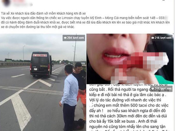Tài khoản facebook H. M viết: “Tài xế xe khách Limousine chạy tuyến Mỹ Đình – Móng Cái trên Quốc lộ 18, mang biển kiểm soát 14B – 033xx không những thu tiền của khách gấp đôi mà còn trả khách giữa đường.