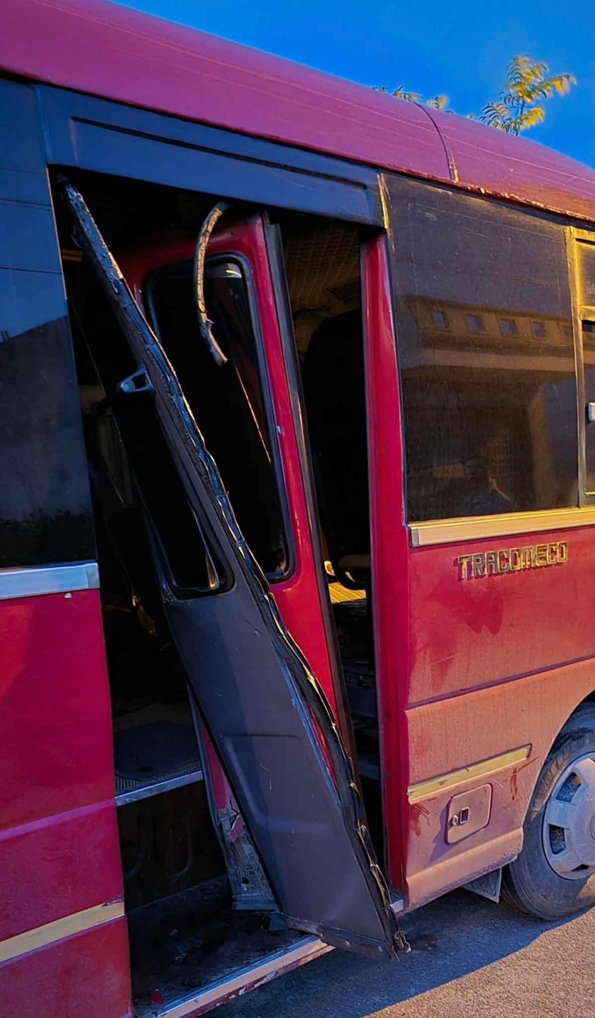 Gần đó, chiếc xe ô tô 36 chỗ ngồi màu đỏ đưa đón học sinh gắn biển Trường Mầm non Hồng Nhung mang biển kiểm soát 17F - 000.91 đang đậu ở lề đường trong tình trạng đã bị đập vỡ 2 tấm cửa kính chính.