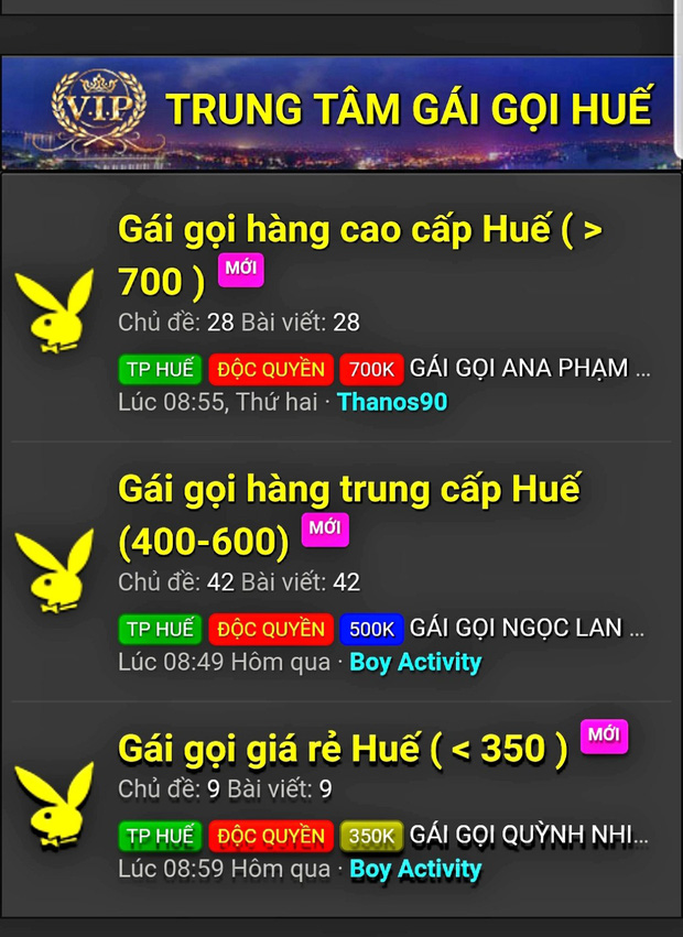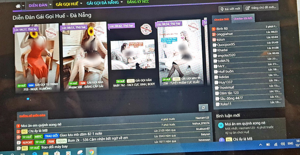 Những mục trong các website với các từ "lóng" như: "CLB Nông dân Huế", "MBTC-MBTM Huế" (Máy bay tình cảm, máy bay thương mại Huế), "Some & Swing Huế", "Kiều nữ & Đại gia Huế (PG A-B)"… luôn trong tình trạng tràn ngập các Nickname ở trạng thái "đang hoạt động" cùng những thông tin chia sẻ, trao đổi liên quan đến mại dâm, tình dục.