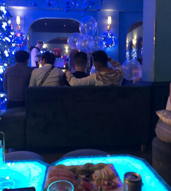 Càng về khuya, càng đông khách đến quán, từng tốp khách nối tiếp nhau chẳng mấy chốc đã lấp đầy cả bar. Đặc biệt, gần như toàn bộ tất cả các bàn ở đây đều sử dụng shisha và “bóng cười”. Lượng khách nhiều đến nỗi những nhân viên luôn luôn có trên tay cả chùm bóng để sẵn sàng phục vụ cho khách khi có yêu cầu.