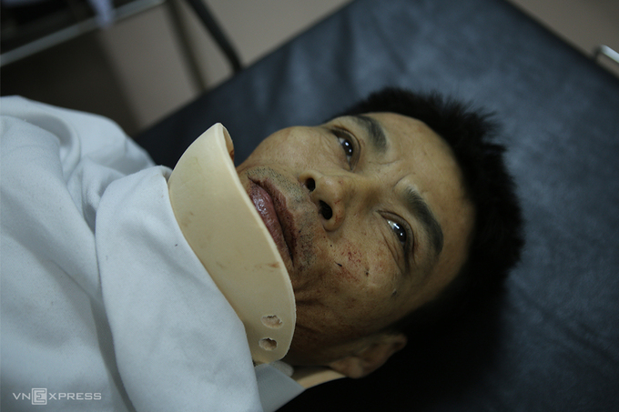 Sau hơn 5 giờ cấp cứu và được nẹp đoạn gãy ở hai cẳng chân, cố định cột sống và ngực, anh Bình vẫn chưa thể tự cử động.