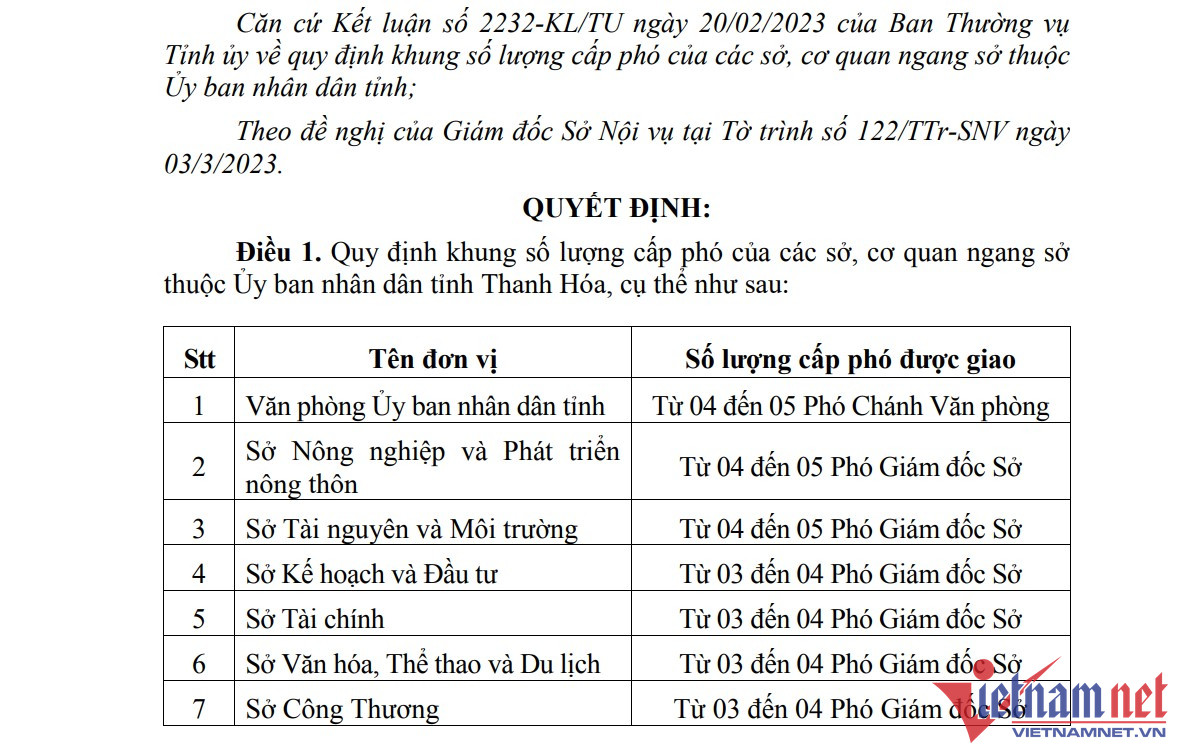 Ngày 20/3/2023 Chủ tịch tỉnh Thanh Hóa ký quyết định “khung số lượng cấp phó của các sở, cơ quan ngang sở thuộc UBND tỉnh Thanh Hóa”. Trong đó, có 8 đơn vị được giao động tăng thêm một phó, điều này khiến dư luận cho rằng Thanh Hóa đang “cầm đèn chạy trước ô tô”.