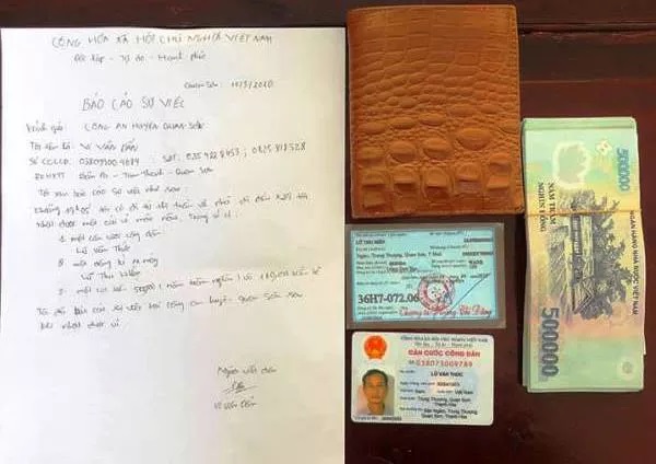 Trước đó, khoảng hơn 19h ngày 10/3 anh Vi Văn Dấn ở bản Pa, xã Tam Thanh, huyện Quan Sơn (hiện là chiến sỹ nghĩa vụ của Công an tỉnh) trong quá trình về nghỉ phép đã nhặt được một chiếc ví da màu nâu bên trong có hơn 48 triệu đồng tiền mặt cùng 1 Căn cước công dân mang tên Lữ Văn Thức và 1 giấy phép lái xe mang tên Lữ Thu Hiền, đều có địa chỉ tại xã Trung Thượng, huyện Quan Sơn, tỉnh Thanh Hóa.
