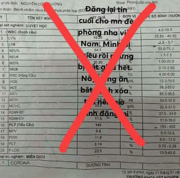 Trước đó, ngày 31-1, G. đã sử dụng tài khoản Facebook cá nhân đăng tải hình ảnh kèm nội dung liên quan một bản kết quả xét nghiệm dương tính với virus corona của Trung tâm Y tế quận Liên Chiểu.