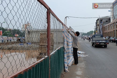 Lực lượng bảo vệ mang bạt ra che kín bên ngoài công trình sau khi vụ tai nạn xảy ra. |