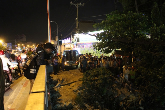| Nhiều người hiếu kỳ đứng xung quanh khu vực cầu Ông Dầu để xem xác chết, lực lượng chức năng phải liên tục nhắc nhở |
