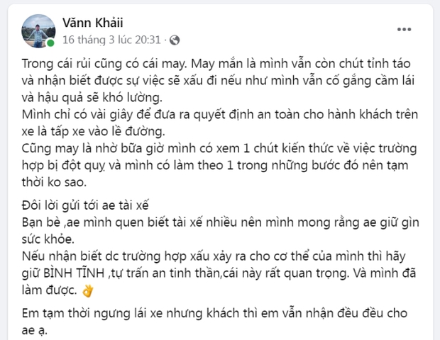 Mới đây, bài đăng của một tài xế may mắn thoát khỏi cơn nguy kịch khi đang lái xe đã thu hút sự chú ý của nhiều người. Được biết, trên đường lái xe, anh đã không may gặp vấn đề về sức khoẻ nhưng may mắn do biết trước triệu chứng và phản ứng kịp thời nên đã bảo toàn được cả tính mạng cho hành khách lẫn bản thân.