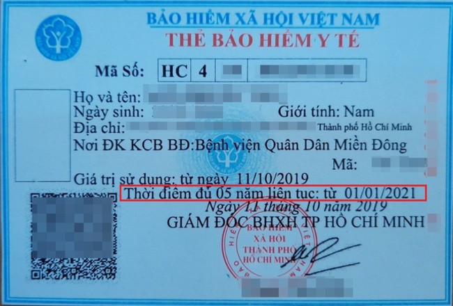 - Thẻ BHYT có dòng chữ "Thời điểm đủ 05 năm liên tục: từ dd/mm/yy" và Giấy tờ tùy thân có ảnh (bản sao).