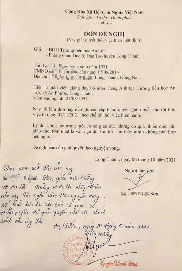 Dưới lá đơn, ông Nguyễn Thanh Tùng, Hiệu trưởng Trường Tiểu học An Lợi đã kí xác nhận vào đơn với nội dung: "Qua xem xét đơn của ông L.T.N. Sơn, giáo viên Trường Tiểu học An Lợi; Trường Tiểu học An Lợi chấp thuận cho ông Sơn nghỉ việc theo nguyện vọng. Kế toán liên hệ với các cơ quan có thẩm quyền để giải quyết chế độ chính sách cho ông Sơn".