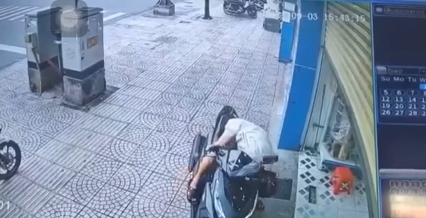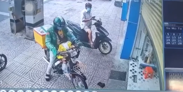 Đáng nói, ngay khi tài xế giao hàng vừa phóng xe máy đi, người đàn ông đứng sau lúc này mới di chuyển đến, cúi xuống nhặt chiếc ví mà nam tài xế vừa đánh rơi.
