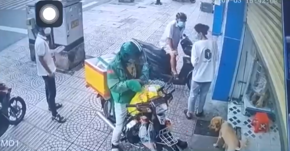 Theo dõi đoạn clip được camera an ninh của nhà dân gắn bên đường ghi lại và lan truyền trên MXH cho thấy, khoảng hơn 15h chiều 3/9, một nam shipper đang dừng xe trên vỉa hè để giao món cho cô gái trẻ.