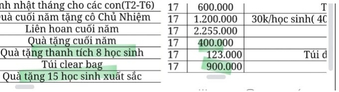 Phụ huynh cũng chia sẻ hình ảnh chụp các khoản chi tiêu của quỹ lớp con mình, trong đó có 2 khoản "Quà tặng thành tích 8 học sinh" và "Quà tặng 15 học sinh xuất sắc" lần lượt là 400.000 và 900.000 đồng.