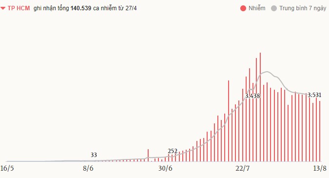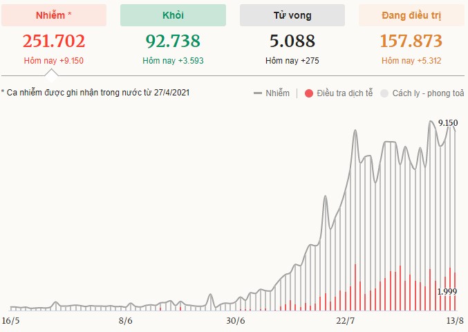 Về tình hình điều trị, 3.593 người được công bố khỏi bệnh trong ngày 13/8, nâng tổng số ca được điều trị khỏi lên 92.738 ca. Số bệnh nhân nặng đang điều trị ICU là 511. Số bệnh nhân nguy kịch đang điều trị ECMO: 20 ca.