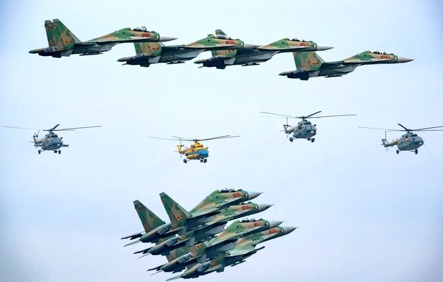 Trước đó, trong các ngày 25 và 26/11, 7 chiếc tiêm kích Su-30MK2, được mệnh danh là 'Hổ mang chúa' hiện đại bậc nhất của Không quân Việt Nam, và 7 chiếc trực thăng Mi các loại đã thực hiện các buổi hợp luyện trên bầu trời khu vực sân bay Gia Lâm, Hà Nội.
