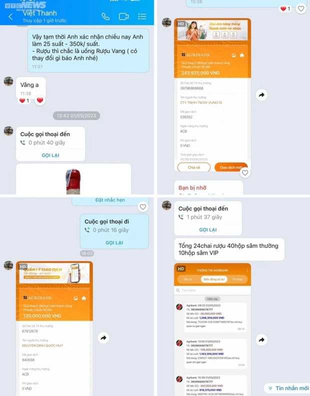 Thời điểm khách gửi hình ảnh giao dịch chuyển khoản thành công, tuy chưa thấy tin nhắn báo tài khoản có tiền song anh Huy nghĩ do ngày nghỉ lễ nên tiền khách chuyển vào tài khoản bị chậm. Chiều 1/5, Nhà hàng Vừng Ơi đã 5 lần chuyển tiền vào tài khoản mang tên Dương Ngọc Khánh (Ngân hàng Vietcombank) để mua rượu và sâm giúp khách đặt tiệc với tổng số tiền 526.260.000 đồng.