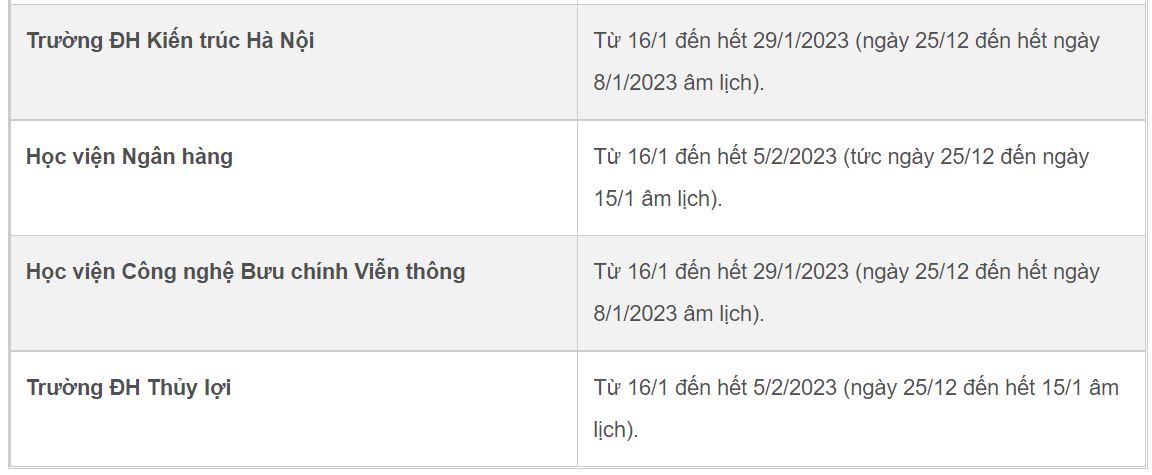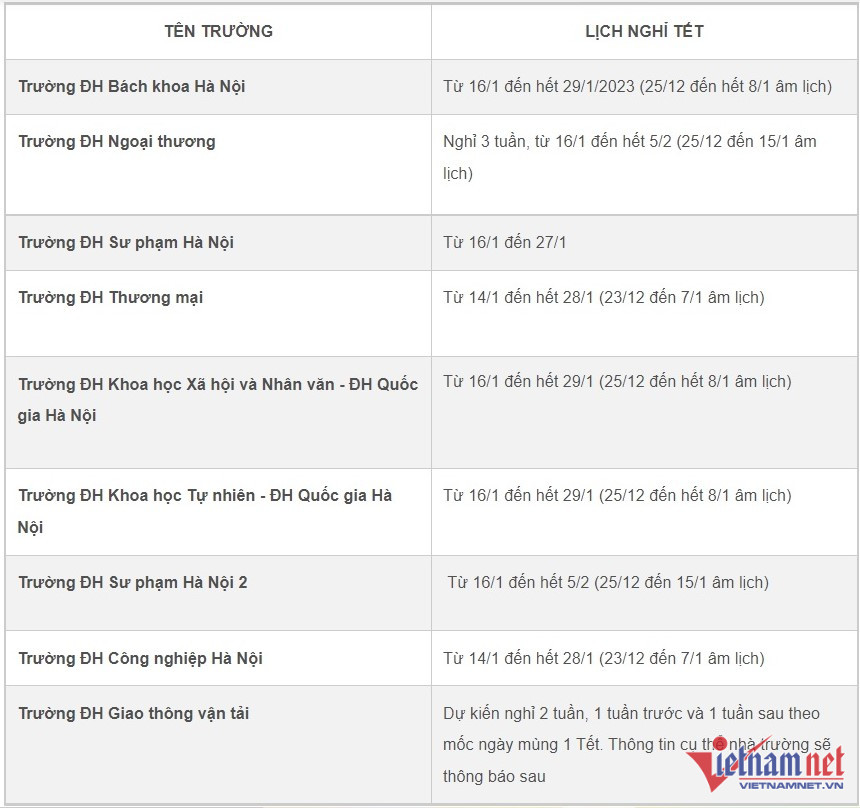 Trước đó, một số trường đại học phía Bắc cũng đã thông báo lịch nghỉ Tết: ĐH Bách khoa, ĐH Ngoại thương, ĐH Sư phạm Hà Nội, ĐH Thương mại, ĐH Công nghiệp Hà Nội, ĐH Giao thông vận tải, ĐH Sư phạm Hà Nội 2...