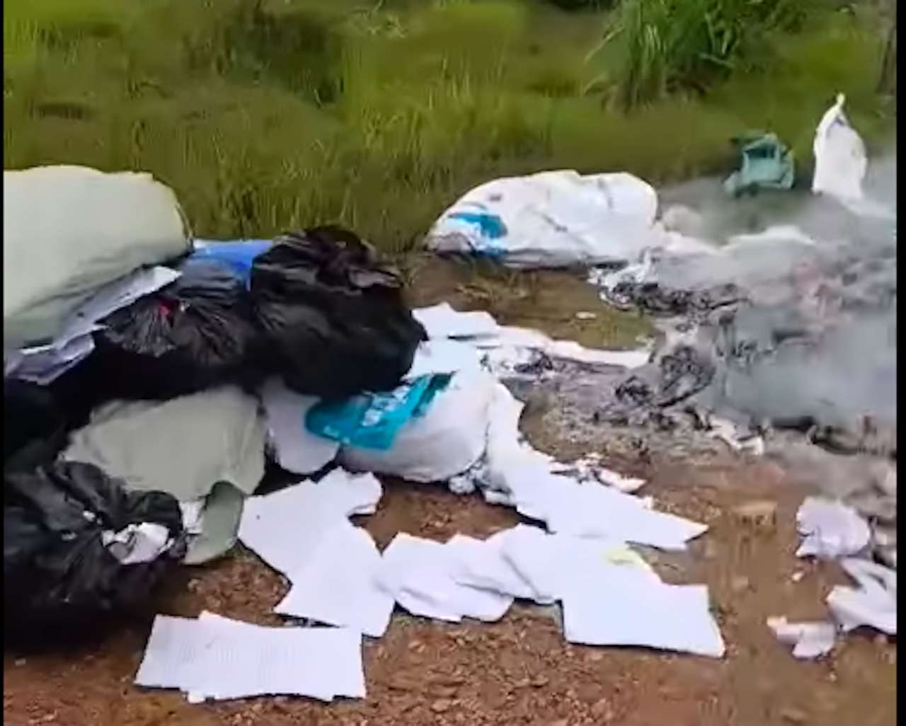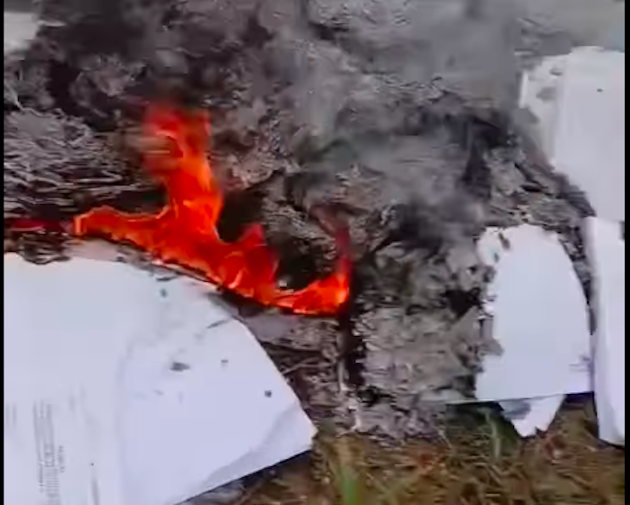 Theo thông tin từ clip lan truyền, sự việc xảy ra vào chiều 28/6. Tại hiện trường, một đám cháy lớn bốc khói kèm mùi khét nồng nặc. Giữa đám tro tàn, nhiều mảnh giấy tờ chưa cháy hết vẫn còn nhìn rõ "dấu đỏ".